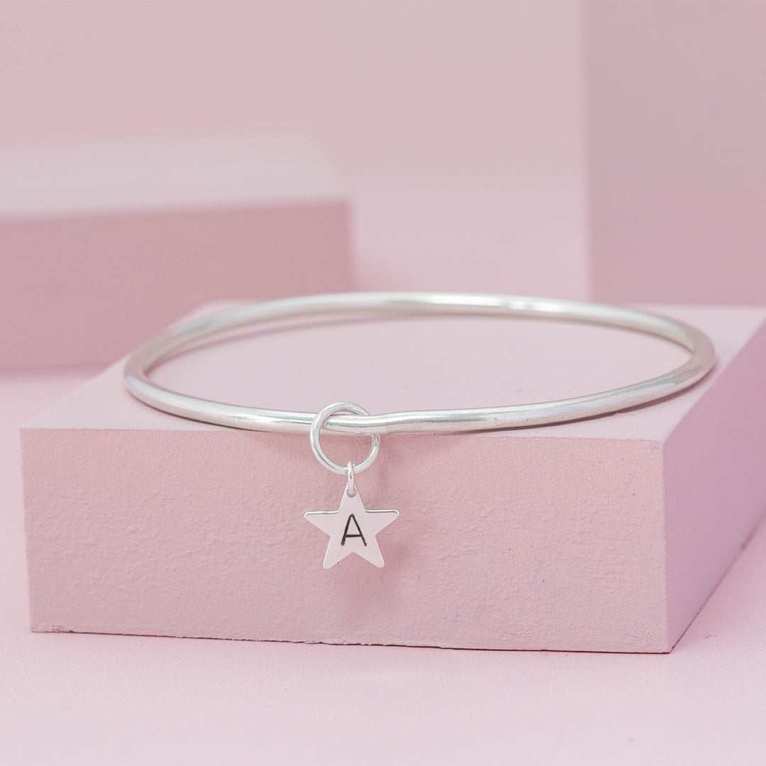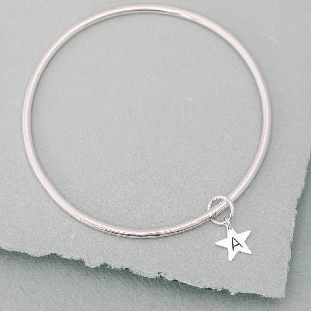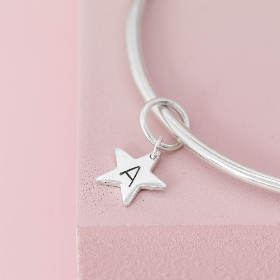 Finished with a hand-stamped star Initial charm, this sterling silver bangle makes a lovely personalised gift. Why not add additional initial charms to represent your family?